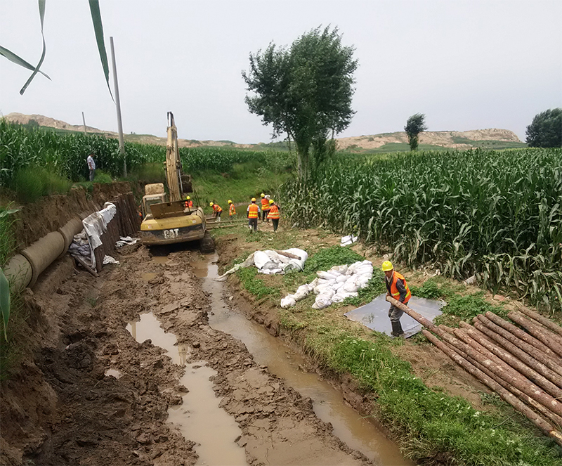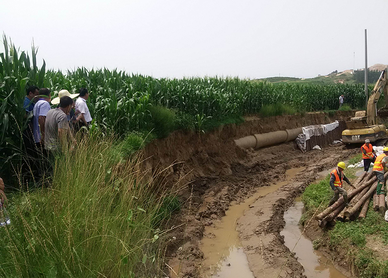 近日,水務(wù)集團組織管網(wǎng)巡查人員排查石門水庫三道嶺系列輸水管線時,發(fā)現(xiàn)位于大石橋湯池鎮(zhèn)黃土嶺村DN900線的輸水管線嚴(yán)重裸露在外,如果不及時處理,再遇雨天,極易發(fā)生輸水管線斷裂,將會造成沿途及營口城區(qū)營口鋼鐵有限公司等數(shù)十家工業(yè)用水大戶及市區(qū)東部周邊部分居民用戶生產(chǎn)生活用水。水務(wù)集團發(fā)現(xiàn)安全隱患后,科學(xué)謀劃,積極制定有效方案,并現(xiàn)場指揮??紤]到若在汛期改線,前期征地、動遷等工作無法在短期時間內(nèi)完成,為保證供水安全度汛,在緊急狀況下,水務(wù)集團及時采取打樁護管、填土、壘石等措施,進行應(yīng)急處理,加固輸水管線,防止管道發(fā)生斷裂。